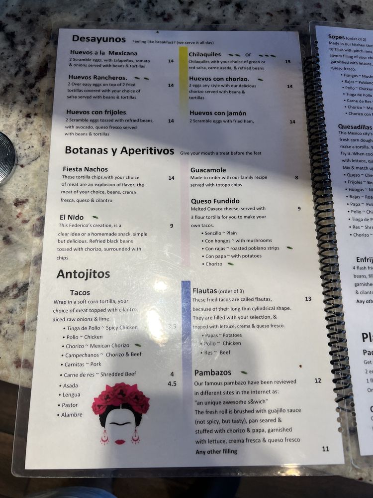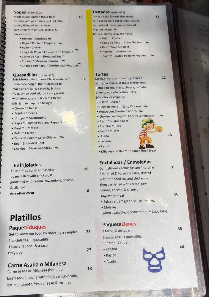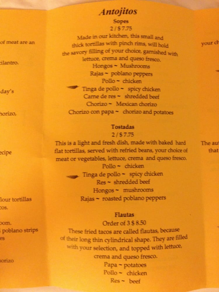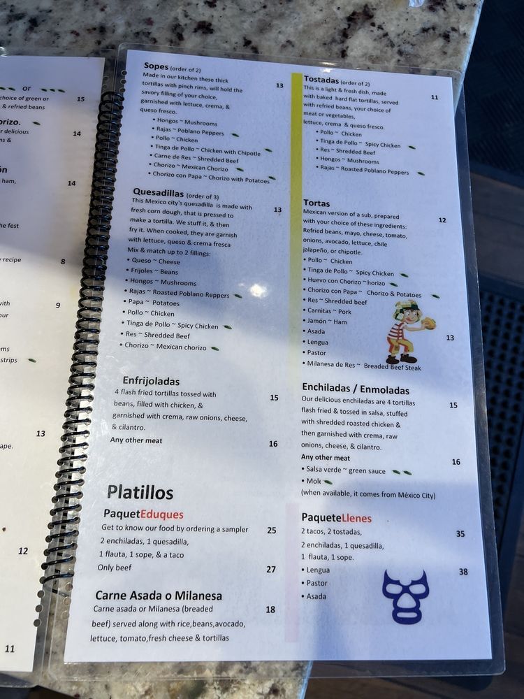 Get to know our food by ordering a sampler: enchiladas, quesadilla, flauta, sope, and a taco