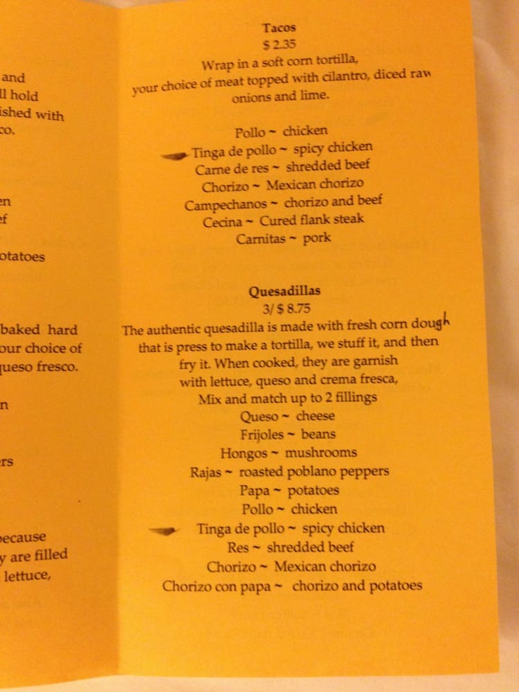 The authentic quesadilla is made with fresh corn dough, that is pressed to make a tortilla. We stuff it, and then fry it. When cooked, they are garnish with lettuce, queso, and crema fresca. Mix and match up to filings